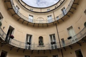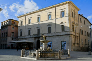 La costruzione del palazzo, che inglobò nel corso del XVII secolo l’antica residenza della famiglia Montegambaro acquisita al tempo dai marchesi Vincentini, procedette rilento e si concluse sul finire del XIX secolo. Nella progettazione furono impegnati vari architetti, fra i quali il toscano Lorenzo Angelini, attivo durante la prima metà del Seicento, a cui spettano gli interventi di riassetto strutturale, ed il romano Giacomo Monaldi, autore dell’elegante prospetto. Il piano terreno si sviluppa intorno al portale d’accesso, incorniciato da due solide colonne che sostengono una piccola loggia. Varcato il portale si accede ad un chiostrino di forma ellittica, dal caratteristico acciottolato in pietre di fiume, su cui affacciano le balconate dei due piani dell’edificio.